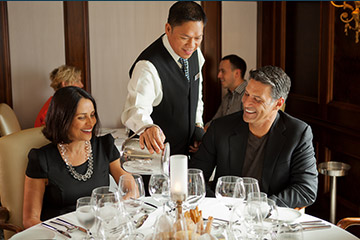 5 コースのお料理とそれぞれに合わせたワインを楽しみながらシニアオフィサーまたはゲストスピーカーの解説を聞くことができます。メニューはフレンチ、イタリアン、カリフォルニアの 3 種類からお選びください。(お一人様$95)